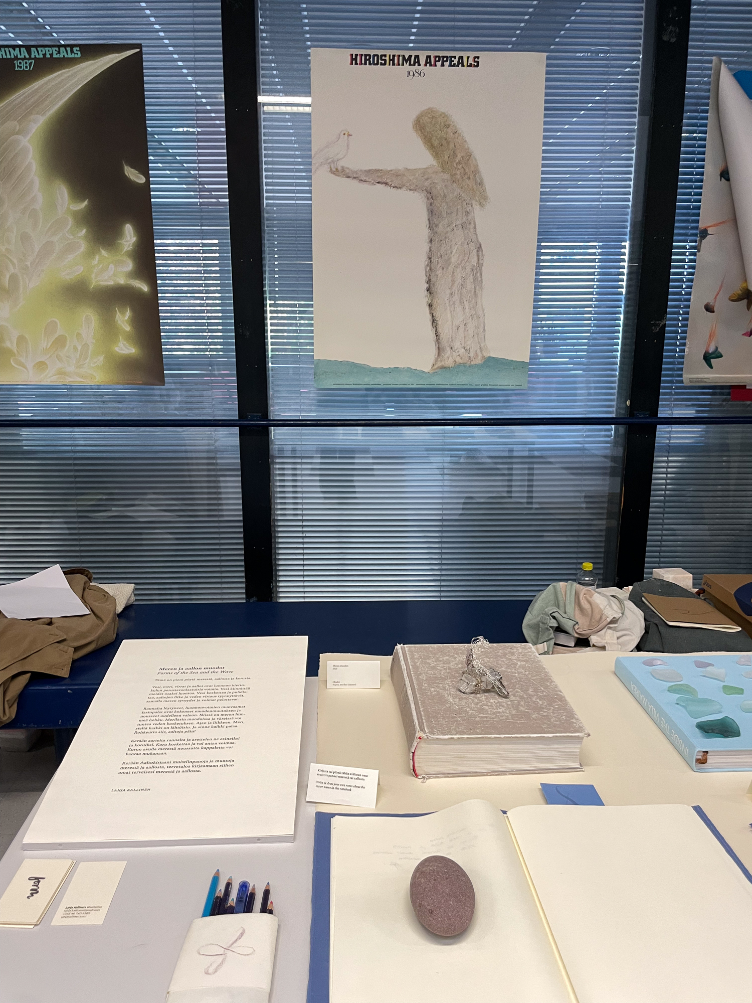 Meren ja aallon muotojoja tutkivan pienen pöytänäyttelykokonaisuuden rakentaminen Suomalais-Japanilaisen Yhdistyksen Japani Matsuri-tapahtumaan. Pöytäni sijaitsi Kintsugi-esittelypöydän ja vanhoista kimonoista tehtyjen työtakkien myyntikojun välissä. Ympärillä avautuen vaikutelmia Japanin kulttuurista. Tunsit, että pilvisenä hehkuva merilasi sopi joukkoon ja se herätti kiinnostusta ja keskustelua. Keskustelut kävijöiden kanssa merestä, aallosta, merilasista, korusta ja kävijöiden piirrosten kerääminen Aaltovihkoon synnyttivät uusia ajatuskulkuja meren ja aaltojen merkitykseen ja merilasiin materiaalina. Sekä siihen, miten ihmiset katsovat korua.